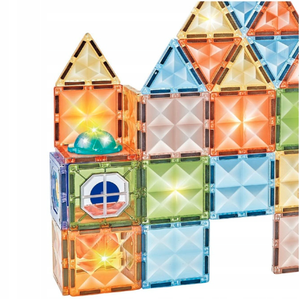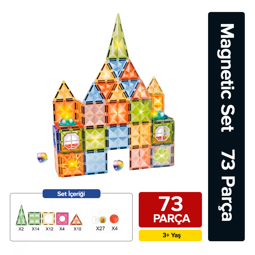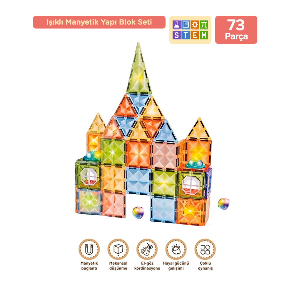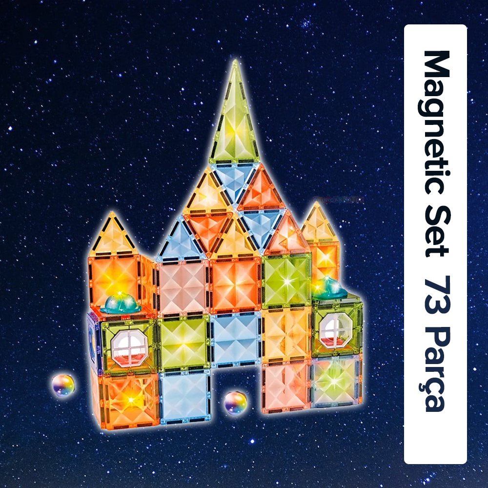Premuim Manyetik Işıklı Yapı Blokları – Çocuklar için Renkli 3 Boyutlu 73 Parça Manyetik Stem Oyun Seti
