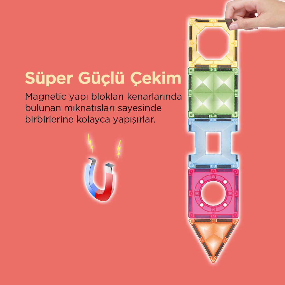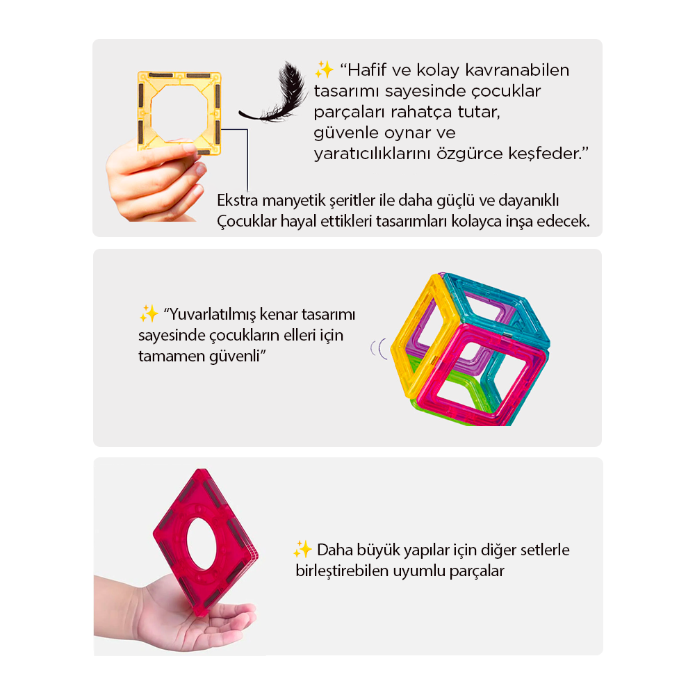 Ekstra manyetik şeritler ile daha güçlü ve dayanıklı olmasını sağlar. Çocuklar hayal ettikleri tasarımları kolayca inşa eder, oyun sırasında parçalar dağılmaz.